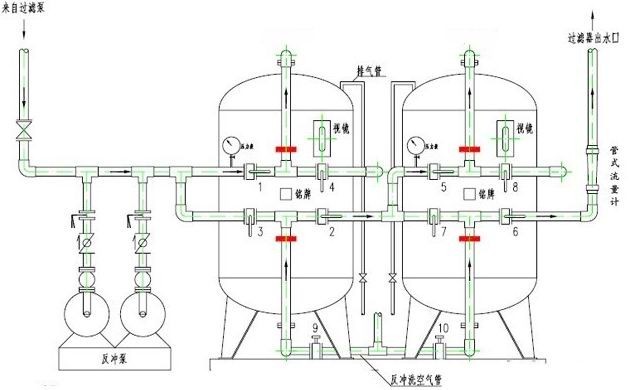 10、當(dāng)運(yùn)行一個周期時要對濾料進(jìn)行反沖洗或水質(zhì)發(fā)生變化時應(yīng)進(jìn)行清洗濾料, 其方法按照操作規(guī)程進(jìn)行,沖洗完畢化驗其水質(zhì)合格后,再投入運(yùn)行。