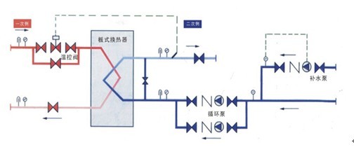 二次回水通過除污器后經(jīng)循環(huán)泵進(jìn)入板式換熱器,被蒸汽或一次高溫水加熱,蒸汽或一次高溫水進(jìn)入板式換熱器后,變成冷凝水回?zé)嵩刺帲纬啥€獨(dú)立系統(tǒng),進(jìn)行間接換熱,補(bǔ)水泵將軟化水打入二次系統(tǒng)中維持壓力穩(wěn)定。